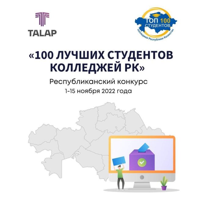 В целях поддержки талантливой молодёжи и популяризации рабочих профессий начался период голосования, определяющий победителей ежегодного республиканского конкурса «100 лучших студентов колледжей РК». Голосование пройдет с 1 по 15 ноября на официальном сайте НАО «Talap (https://kasipkor.kz/prod/top100/index.php). Желаем всем участникам удачи!