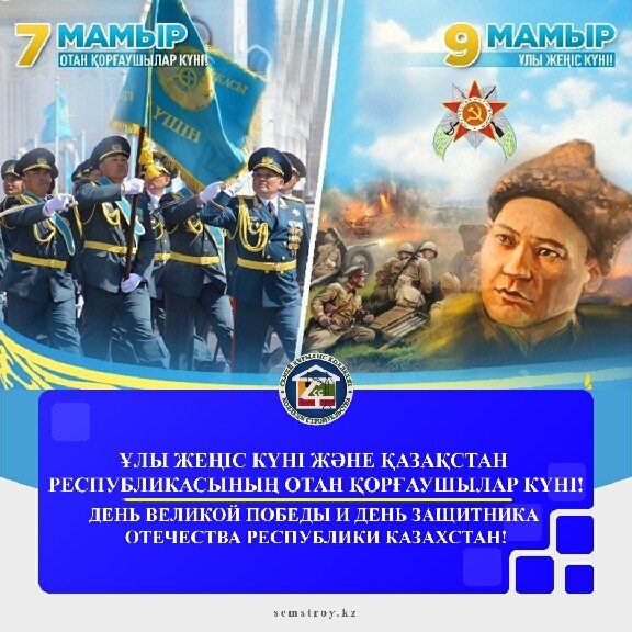 Уважаемые сотрудники и студенты колледжа строительства! Поздравляем Вас с 9 мая — Днём Победы и с 7 мая — Днём защитника Отечества Республики Казахстан!